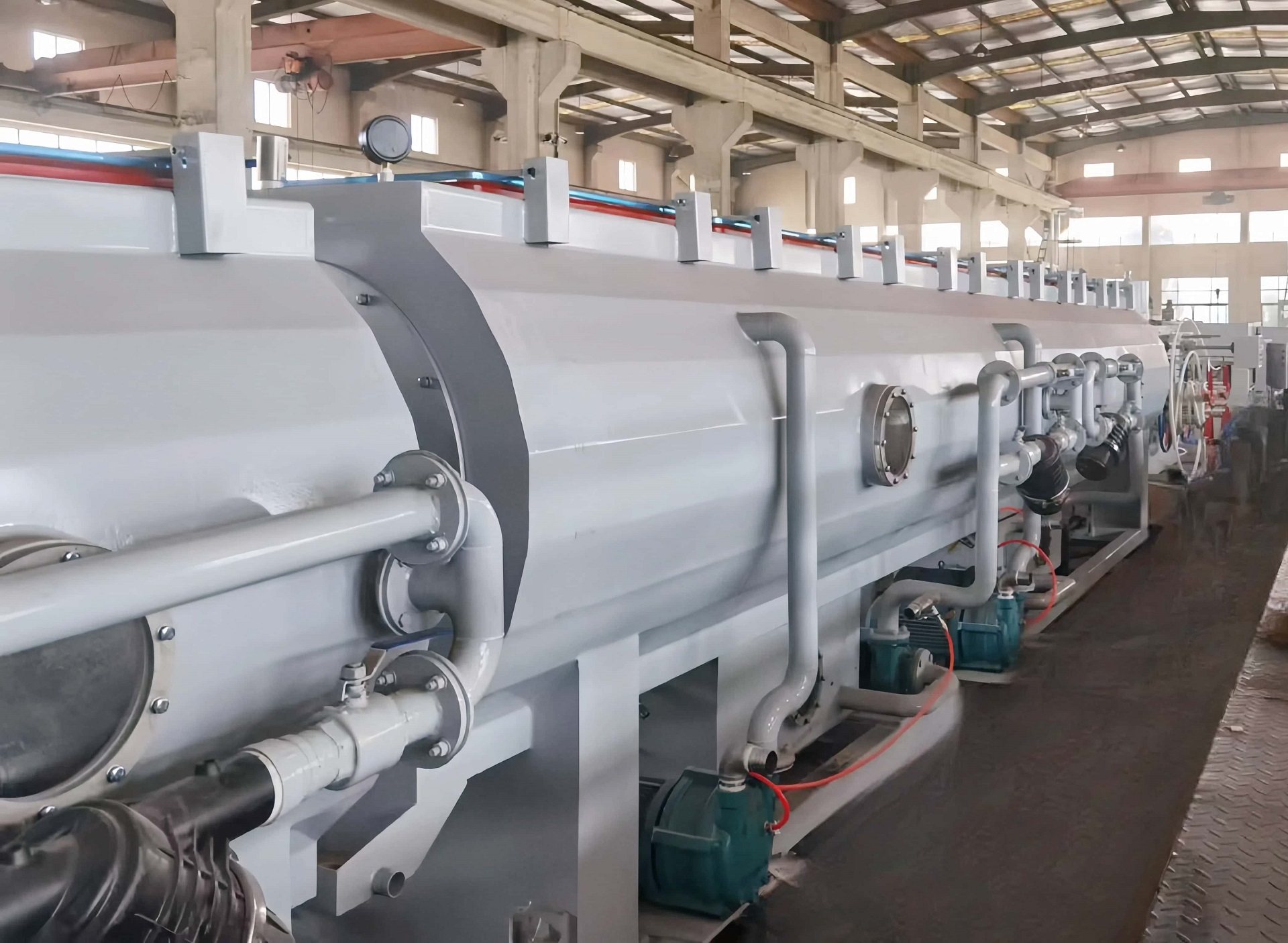 冷却和定径系统的独特设计,使用水循环冷却 HDPE(PP,ABS) 原料,都适合上述原料的冷 却。设计上的独特性可以提高直径尺寸的稳定性和圆整度,满足厚壁管生产的需要。