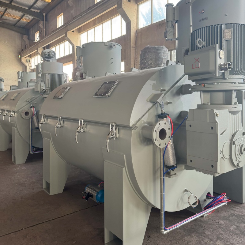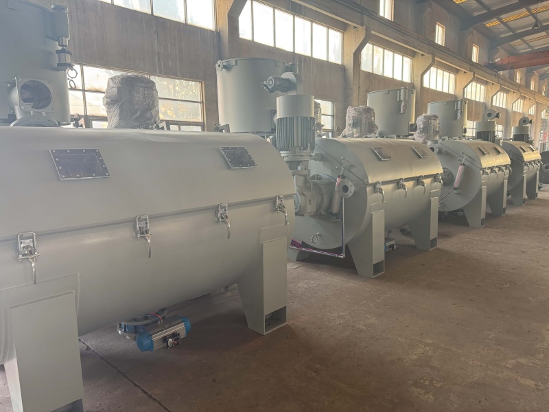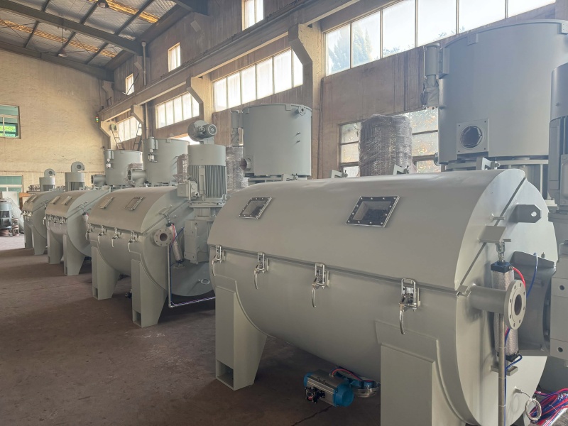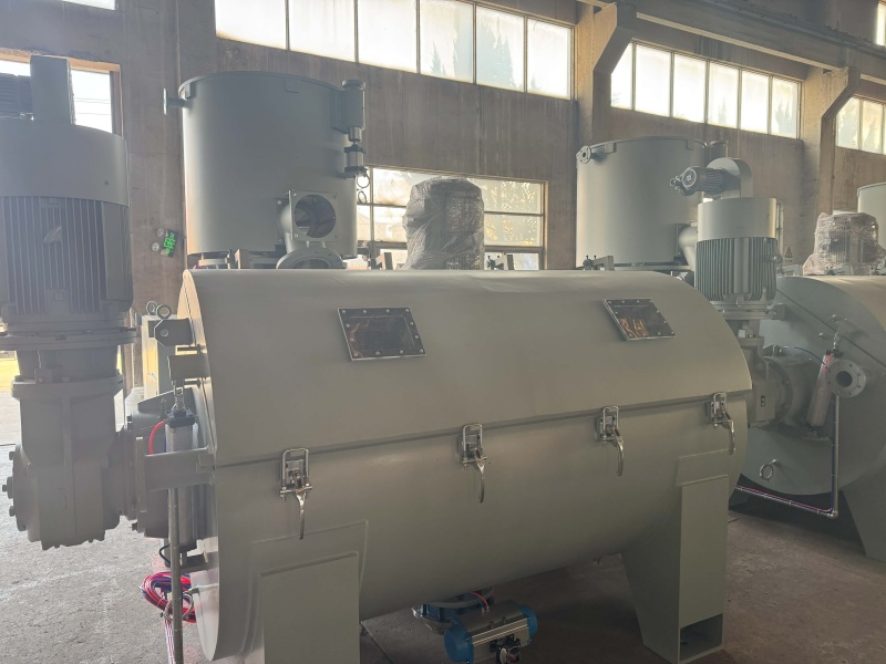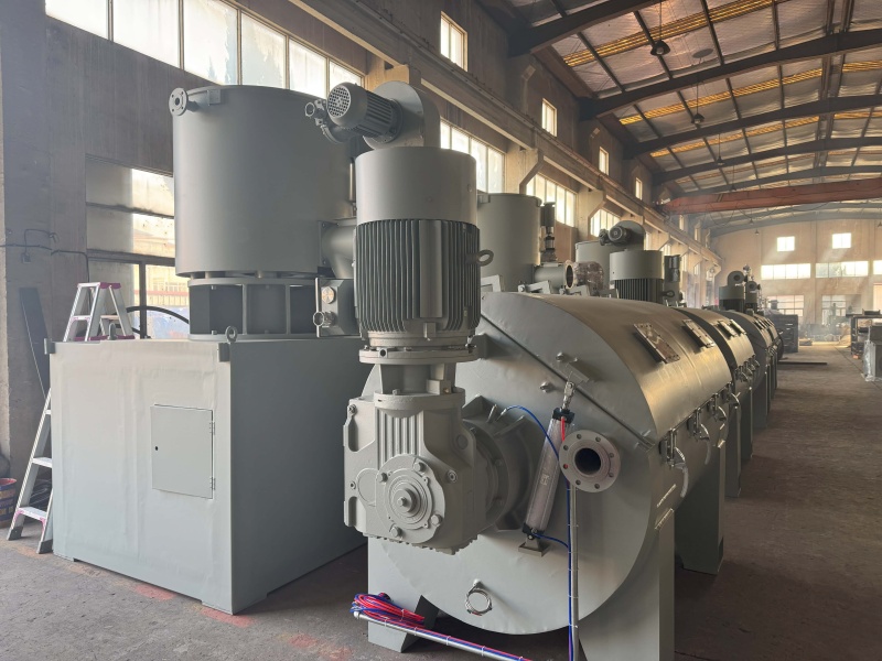该机组采用热混和卧式冷混相结合的工艺,此工艺对产能大的热混物料排放到卧式冷混中可 实现快速冷却。电器仪表全部采用进口品牌电器,并使用 PLC 电脑编程控制,具有自动化程度高,混合速度快的特性。设备桨叶为精密不锈钢压力铸造,且通过动平衡测试。特别是冷 混机桨叶采用国外先进的螺旋搅拌结构,整个容器内没有死角。设备优点:卧式冷混的冷却 面大,冷却速度快,出料干净,混合效果已达到国外先进水平。
